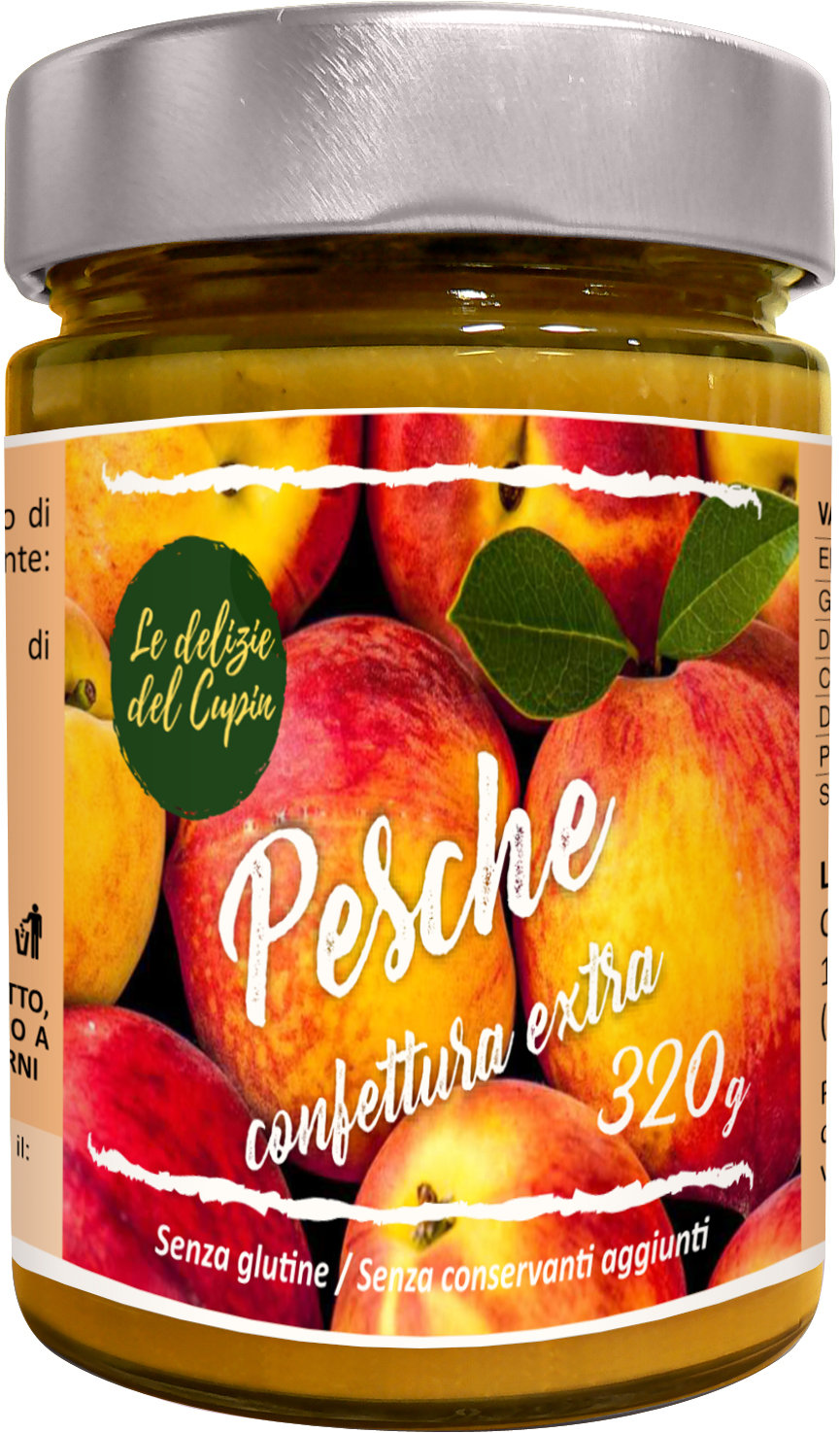 Ingredienti: Pesche 68%, zucchero di canna, succo di limone. Gelificante: pectina. Frutta utilizzata 68g per 100g di prodotto finito.