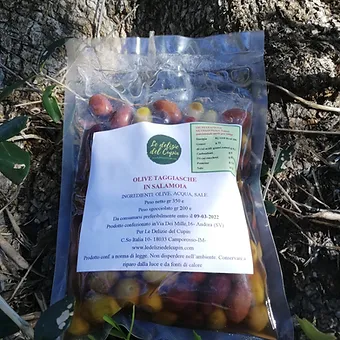 Olive taggiasche in salamoia in Busta da 200gr scelte accuratamente a mano una ad una e messe in salamoia secondo l’antica ricetta tradizionale ligure. IN CUCINA Potete gustare le olive taggiasche in salamoia come stuzzicante aperitivo o come antipasto, nei sughi per i vostri primi piatti, ma anche per arricchire insalate, pizze e focacce. Non dimentichiamo le olive nel famoso Coniglio alla Ligure…. SENZA CONSERVANTI E SENZA COLORANTI, SENZA GLUTINE, Peso netto 350gr, Peso Snocciolato 200Gr. PROVALI INSIEME A TUTTA LA LINEA TAGGIASCA: olio extravergine di oliva 100% cultivar taggiasca L’Olio del Nonno e il Paté di Olive Taggiasche 100%.